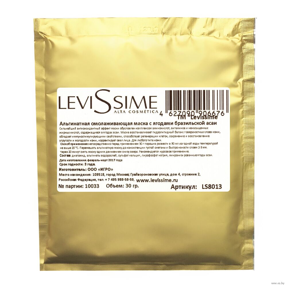 Сильнейший антиоксидантный эффект альгинатной омолаживающей маски Levissime с ягодами бразильской асаи обусловлен комплексом аминокислот, витаминов и ненасыщенных жирных кислот, содержащиеся в этих ягодах. Маска восстанавливает гидролипидный баланс поверхностных слоев кожи, обладает иммуностимулирующими свойствами, способствует регенерации клеток, сохранению и восстановлению упругости и молодости кожи, корректирует овал лица. Для любого типа кожи.