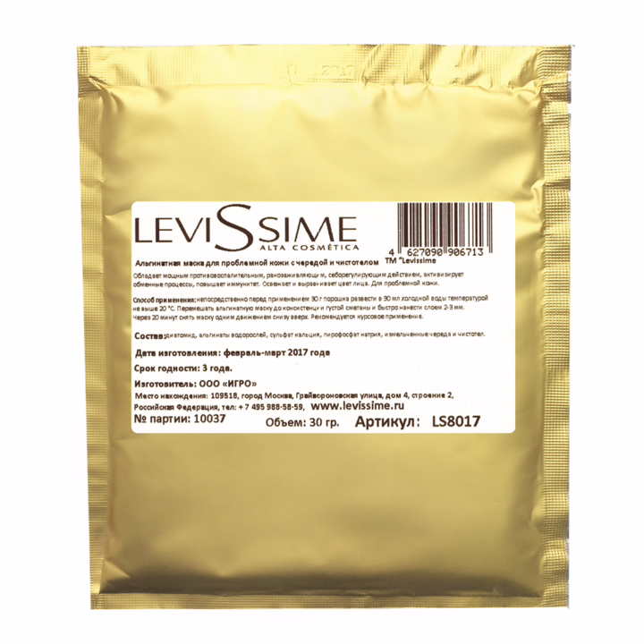 Альгинатная маска Levissime для проблемной кожи с чередой и чистотелом обладает мощным противовоспалительным, ранозаживляющим, себорегулирующим действием, активизирует обменные процессы, повышает иммунитет. Освежает и выравнивает цвет лица. Для проблемной кожи.