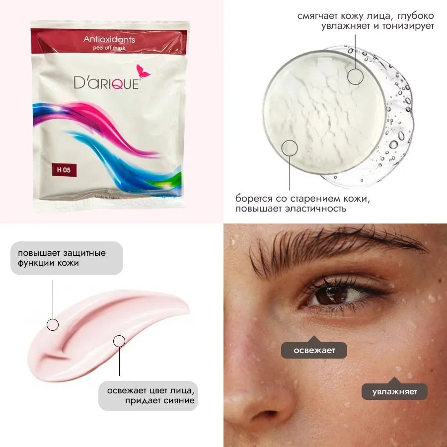 Альгинатная маска с антиоксидантами от Darique рекомендуется как средство борьбы со старением. Благодаря специфическому витаминному и минеральному составу маска оказывает выраженное антиоксидантное действие, уменьшает признаки старения, повышает защитные свойства кожи, увлажняет, насыщает ее энергией, восстанавливает естественное сияние кожи, особенно в условиях стресса и переутомления.