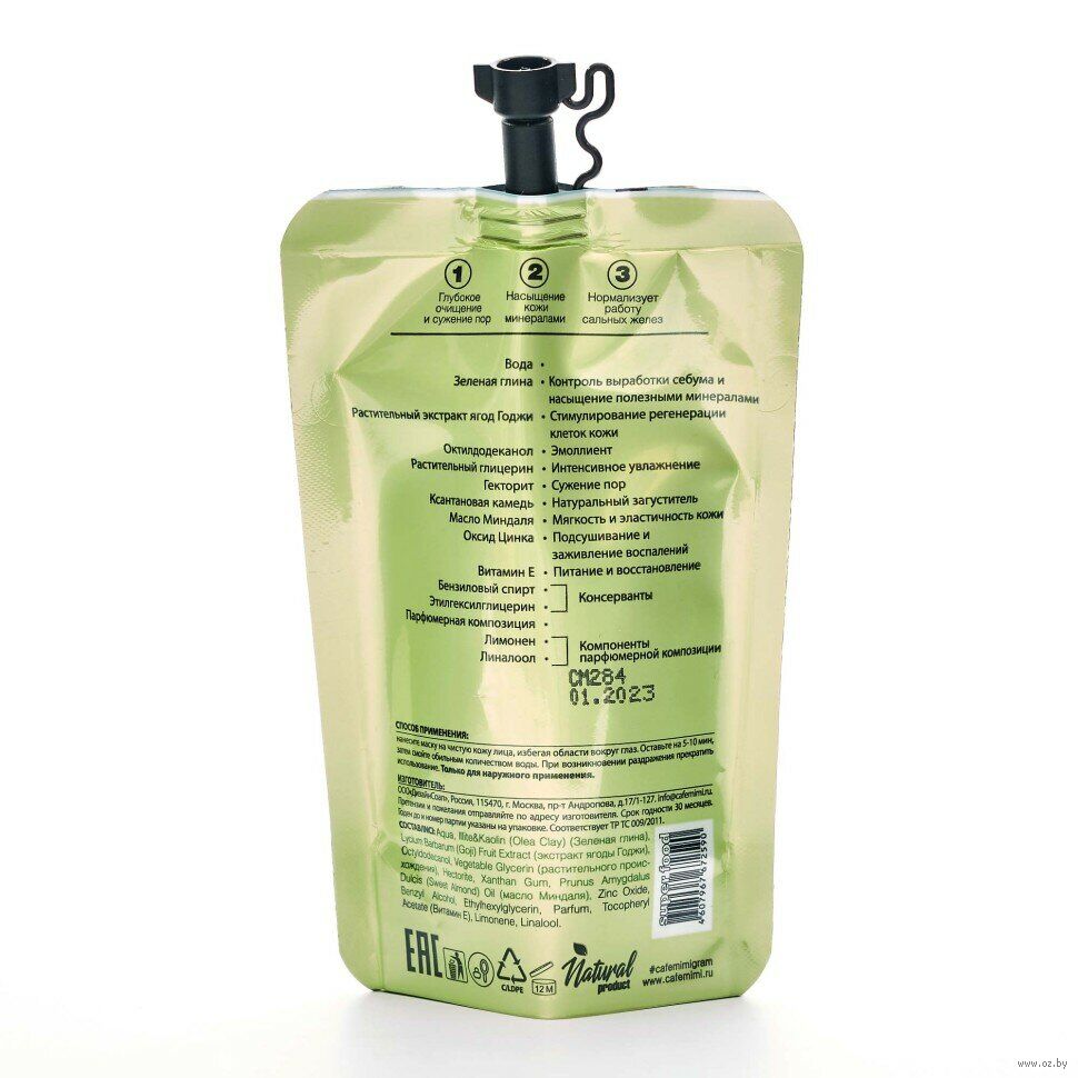 Aqua, Illite&Kaolin (Olea Clay) (Зеленая глина), Lycium Barbarum (Goji) Fruit Extract (экстракт ягоды Годжи), Octyldodecanol, Vegetable Glycerin (растительного происхождения), Hectorite, Xanthan Gum, Prunus Amygdalus Dulcis (Sweet Almond) Oil (масло Миндаля), Zinc Oxide, Benzyl Alcohol, Ethylhexylglycerin, Parfum, Tocopheryl Acetate (Витамин Е), Limonene, Linalool.