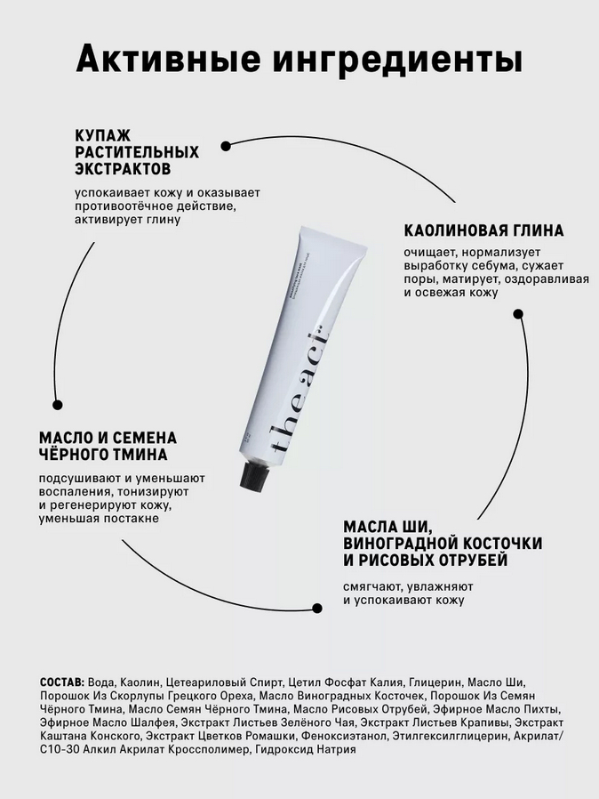 Вода, Каолин, Цетеариловый Спирт, Цетил Фосфат Калия, Глицерин, Масло Ши, Порошок из Скорлупы Грецкого Ореха, Масло Виноградных Косточек, Порошок из Семян Чёрного Тмина, Масло Семян Чёрного Тмина, Масло Рисовых Отрубей, Эфирное Масло Пихты, Эфирное Масло Шалфея, Экстракт Листьев Зелёного Чая, Экстракт Листьев Крапивы, Экстракт Каштана Конского, Экстракт Цветков Ромашки, Феноксиэтанол, Этилгексилглицерин, Акрилат/С10-30 Алкил Акрилат Кроссполимер, Гидроксид Натрия.