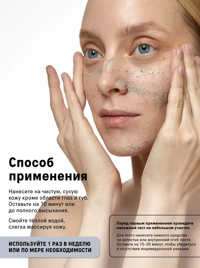 Нанесите на чистую и сухую кожу, избегая области вокруг глаз, оставьте до полного высыхания, затем тщательно смойте тёплой водой. Используйте 1 раз в неделю или по мере необходимости.Состав
