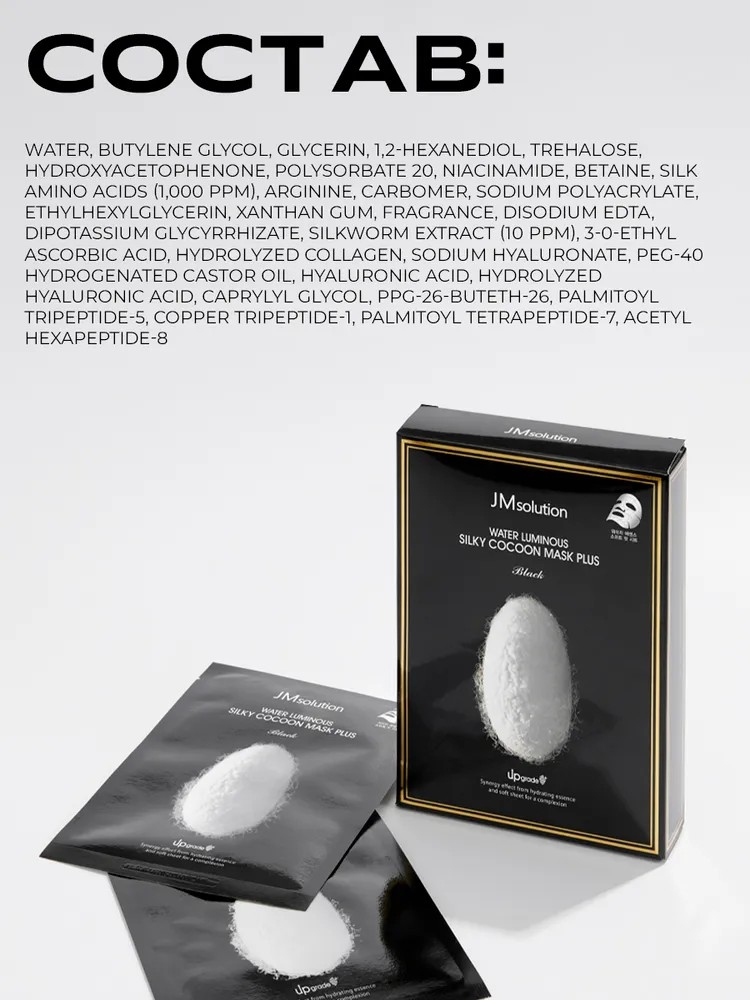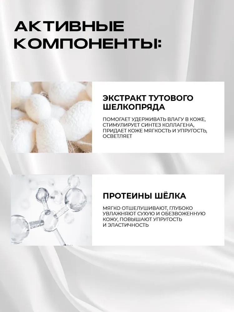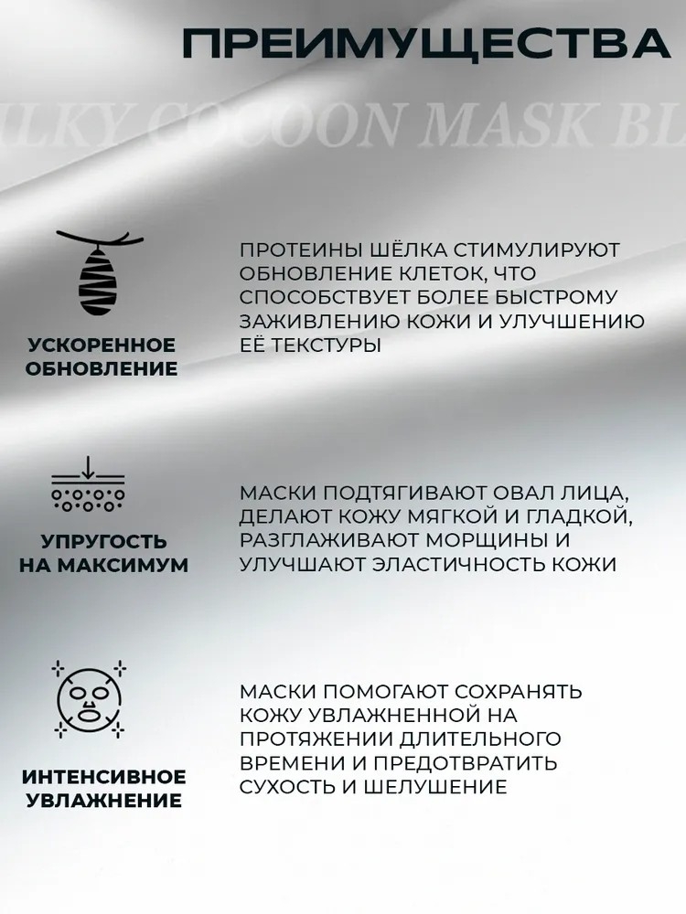 Маска насыщена аминокислотами шелка. Эффективно восстанавливает эластичность и гладкость кожи. Укрепляет защитный барьер, поддерживает оптимальный водный баланс кожи благодаря гиалуроновой кислоте и трегалозе.
