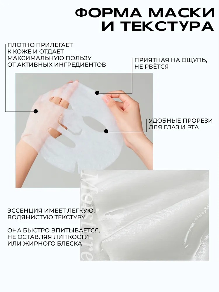 Ультратонкая эластичная основа маски плотно прилегает к коже, и улучшает проникновение всех компонентов средства глубоко в клетки кожи. Основа пропитана концентрированной эссенцией для восстановления упругости кожи и разглаживания кожных заломов.