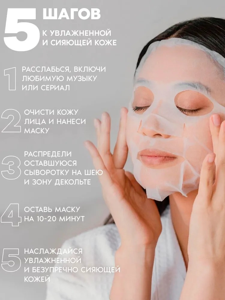 Извлеките маску из упаковки, плотно приложите маску к лицу и оставьте на 10-20 минут. Снимите маску, а остатки эссенции вбейте в кожу мягкими похлопывающими движениями.Состав