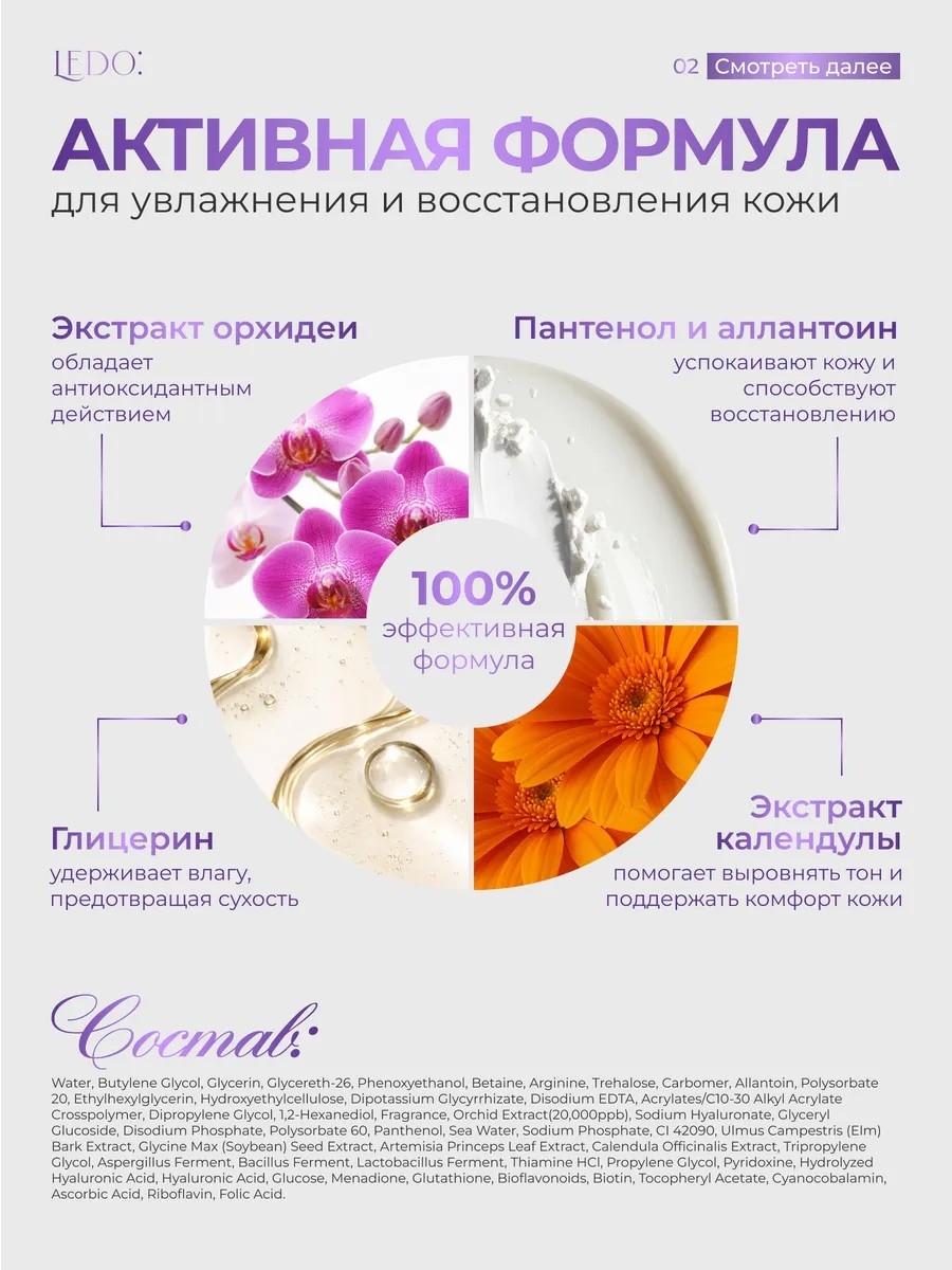 В состав входит экстракт орхидеи, он обладает тонизирующим и противовоспалительным эффектом, смягчает кожу и запускает процессы регенерации, нормализует баланс влаги в коже, также известен своими высокими антиоксидантными свойствами.