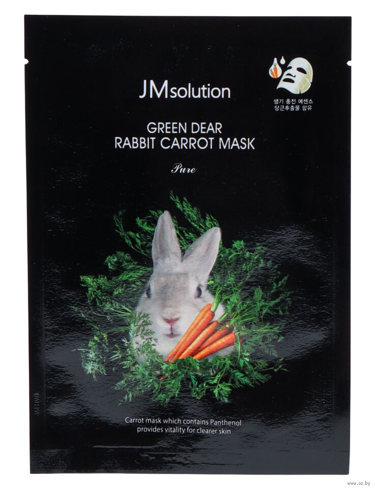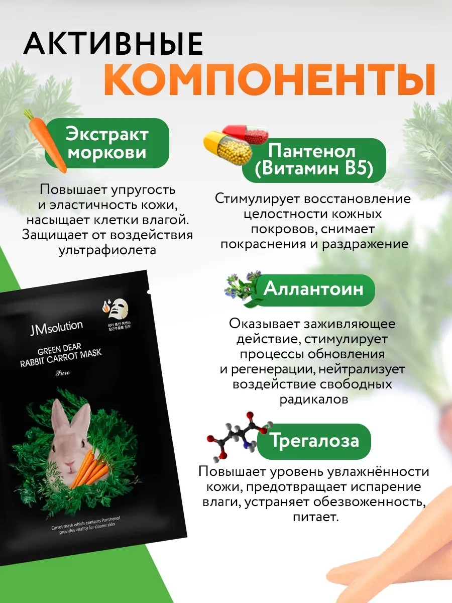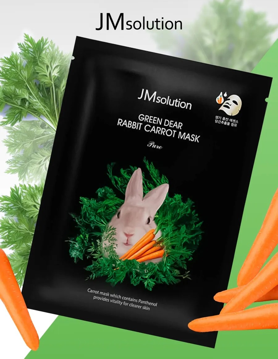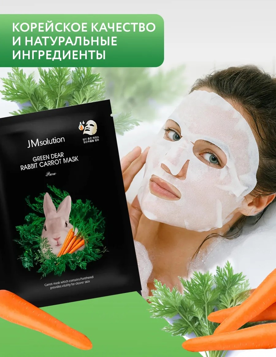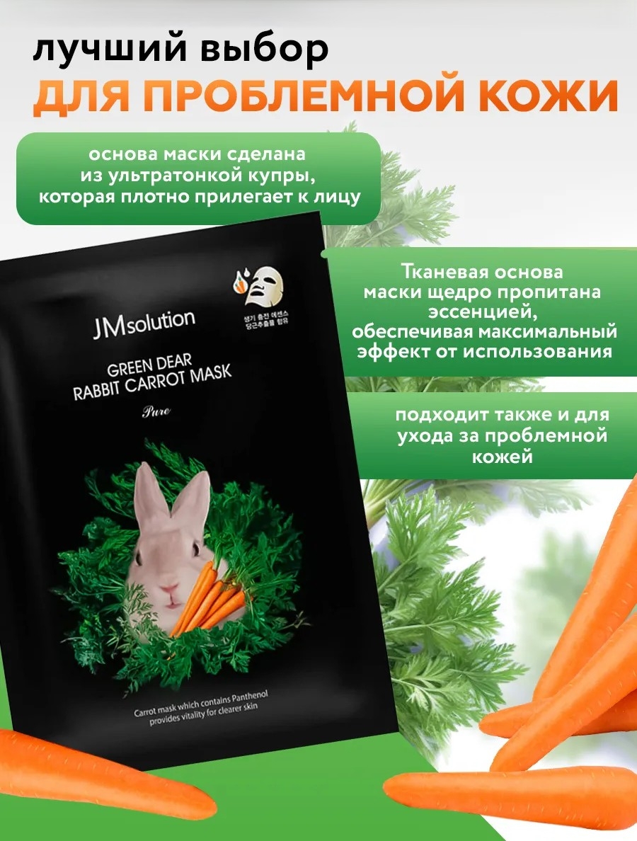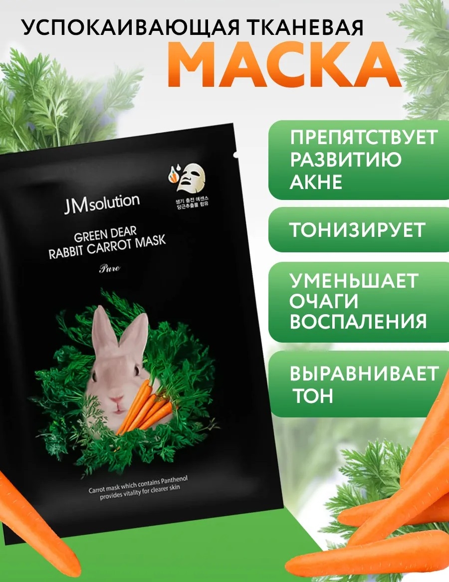Успокаивающая тканевая маска с экстрактом моркови JM solution Green Dear Rabbit Carrot Mask уменьшает очаги воспаления, препятствует развитию акне и угревой сыпи, снимает неприятные ощущения и зуд. Маска приятно освежает кожу, ускоряет заживление раздражений.