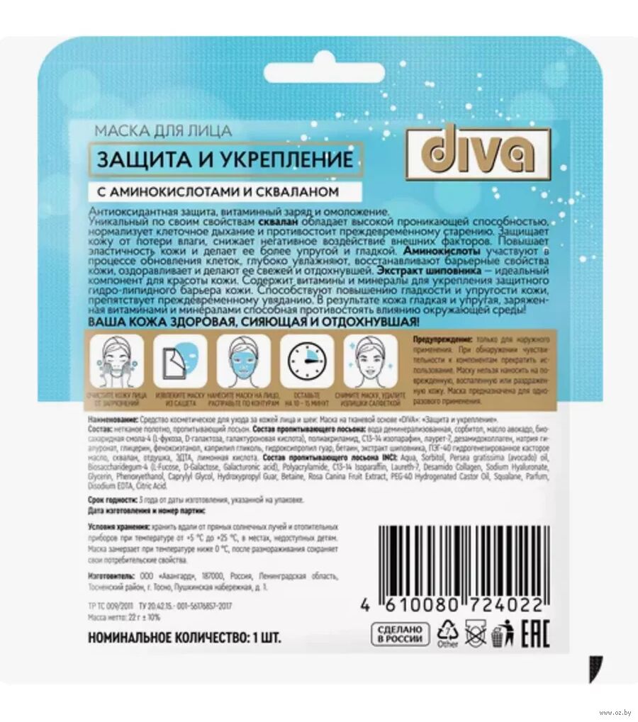 Diva маска для лица на тканевой основе "Защита и Укрепление" с аминокислотами и скваланом. Антиоксидантная защита, витаминный заряд и омоложение. Уникальный по своим свойствам сквалан обладает высокой проникающей способностью, нормализует клеточное дыхание и противостоит преждевременному старению. Защищает кожу от потери влаги, снижает негативное воздействие внешних факторов. Повышает эластичность кожи и делает её более упругой и гладкой.