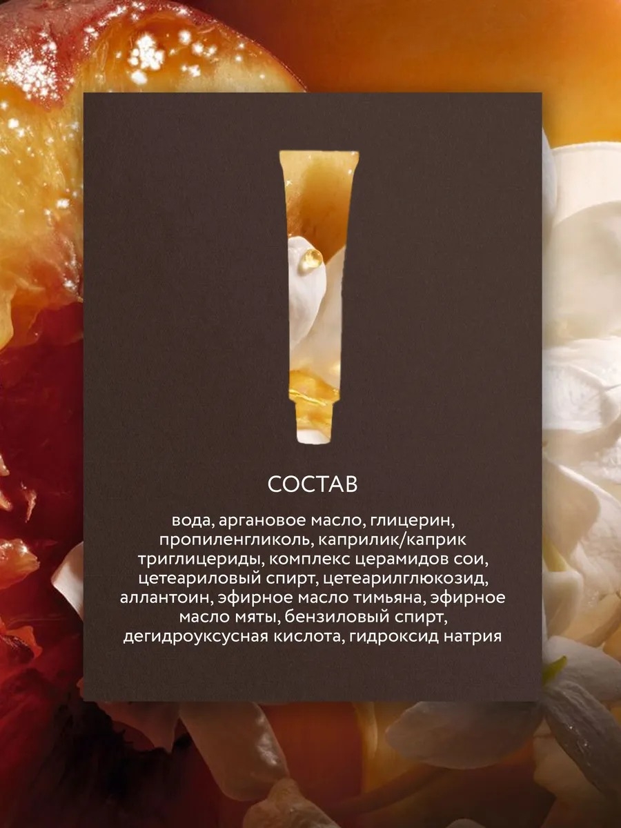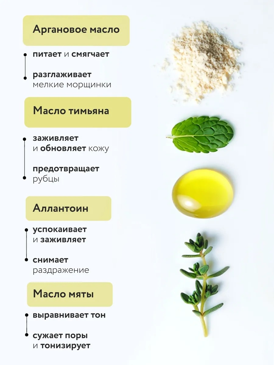 Вода, аргановое масло, глицерин, пропиленгликоль, каприлик/каприк триглицериды, комплекс церамидов сои, цетостеариловый спирт, цетилглюкозид, аллантоин, эфирное масло тимьяна, эфирное масло мяты, бензиловый спирт, дегидроуксусная кислота, гидроксид натрия.