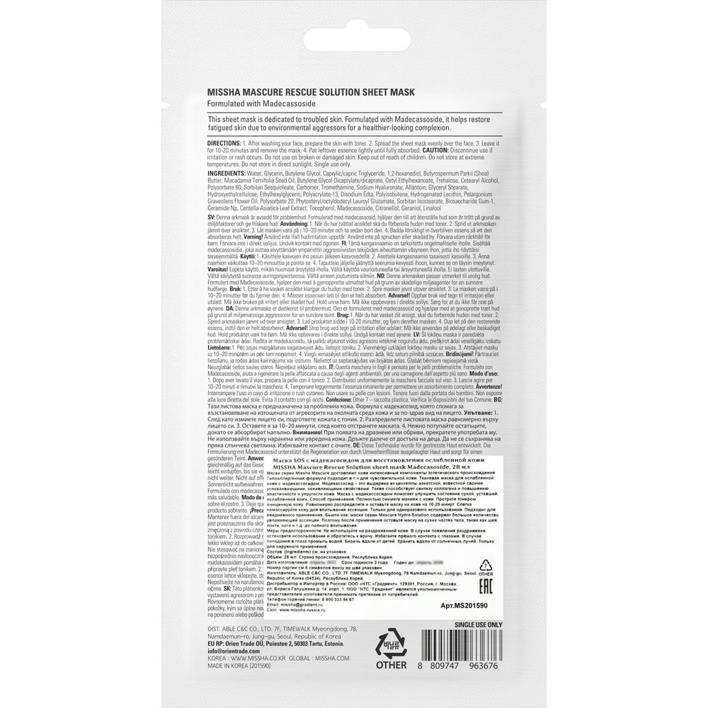 Одноразовая тканевая маска Missha Mascure Sheet Mask Madecassoside с мадекассосидом предназначена для быстрого и эффективного увлажнения и восстановления сухой, ослабленной и обезвоженной кожи. Маска рекомендуется в качестве успокаивающего косметического средства после активного солнца, пребывания в кондиционированном и сильно отапливаемом помещении, пилингов и процедур с AHA-кислотами.