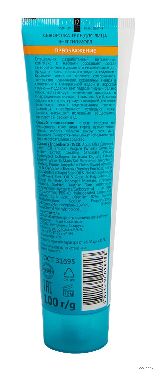 | Изготовитель | СОАО Парфюмерно-косметическая фабрика "Модум - наша косметика", Республика Беларусь, 220007 г. Минск, ул. Володько, 6/6-5 |