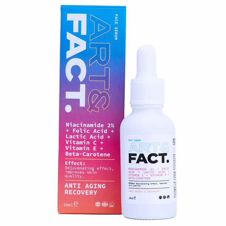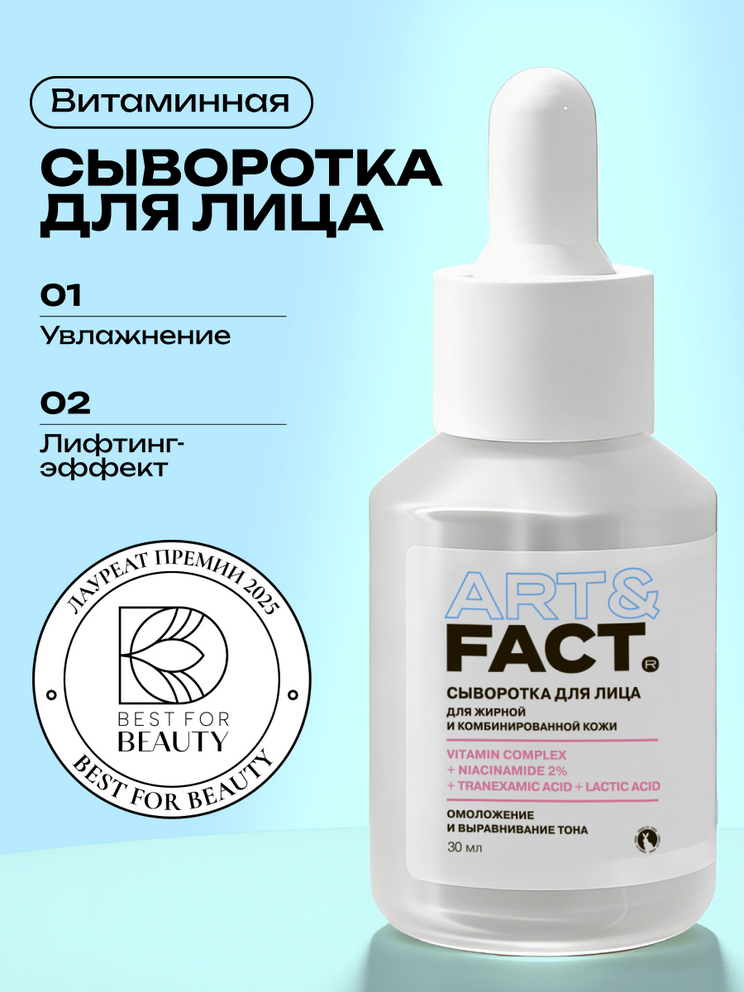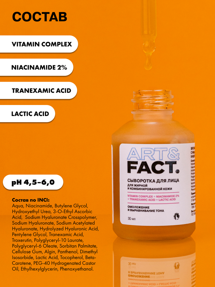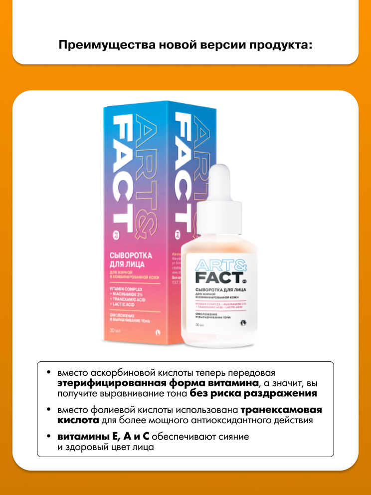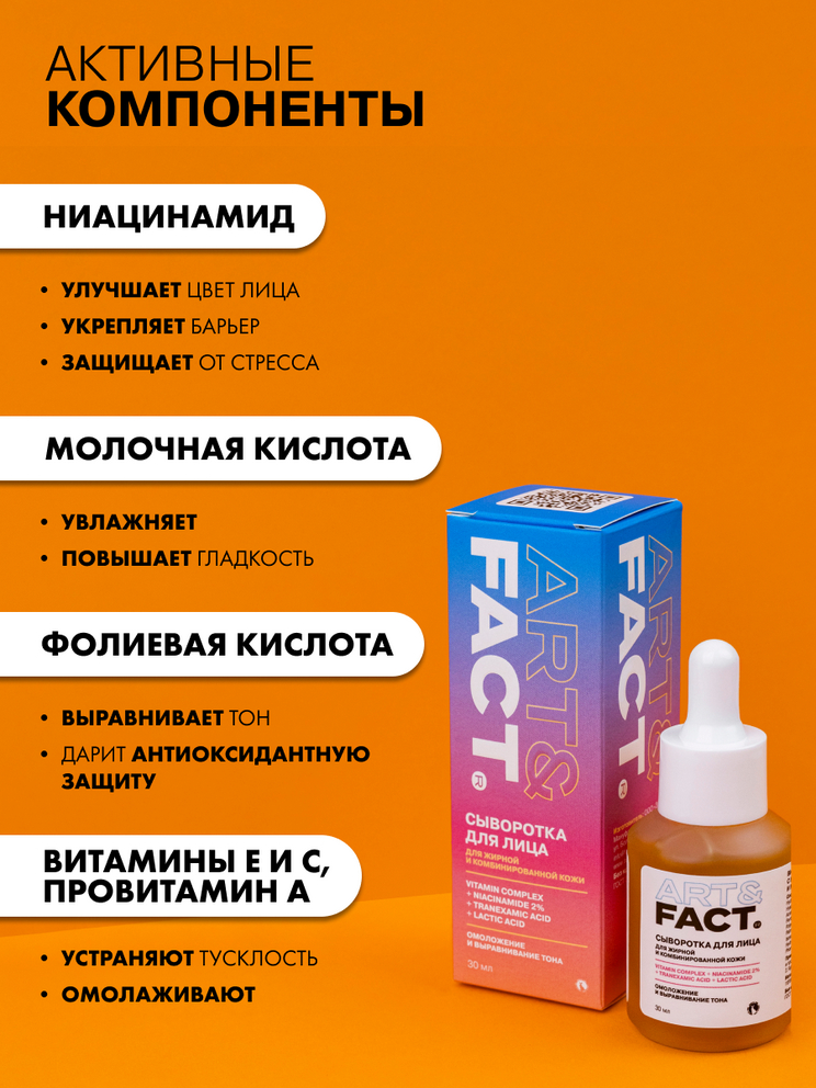 Витаминная сыворотка для лица с ниацинамидом, фолиевой и молочной кислотой, витамином Е, С, и бета-каротином (провитамином А).