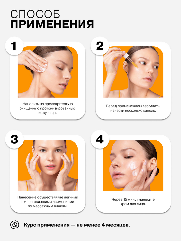 Наносить на очищенную, протонизированную кожу. Курс применения не менее 4 месяцев.Состав