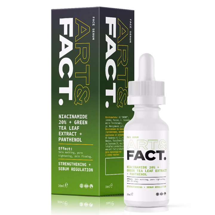 Сыворотка для лица себорегулирующая с ниацинамидом 20 %, экстрактом зеленого чая и пантенолом.