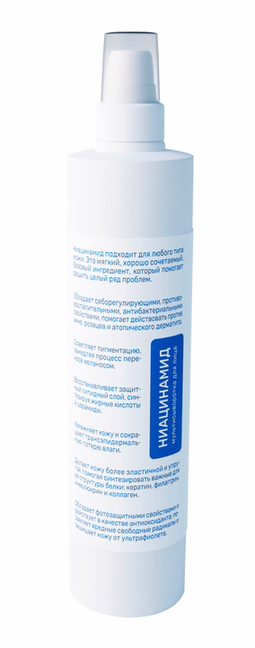 Мультифункциональный компонент для любого типа кожи. Ниацинамид, или водорастворимый витамин B3, – идеальный базовый ингредиент для ухода за кожей. Этот исключительно многофункциональный компонент подойдёт коже любого типа и поможет решить целый ряд проблем. Обладает доказанной эффективностью в концентрациях от 2%.