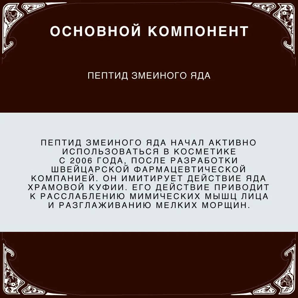 Snake Peptide Complex – пептид, который расслабляет лицевые мышцы, блокирует нейропередачу кожных рецепторов, расслабляет лицевые мускулы, уменьшая тем самым мимические морщины, обладает ботокс-эффектом. Молочная кислота – оказывает мощное кератолитическое и осветляющее действие, укрепляет защитные функции эпидермиса.