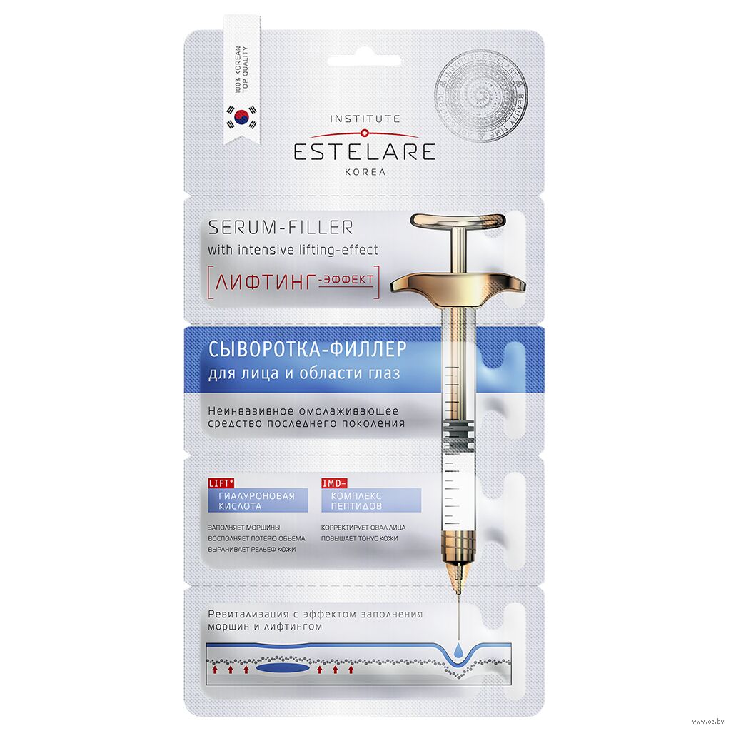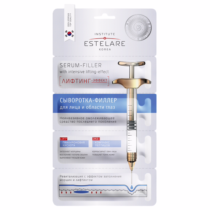 Сыворотка-филлер с эффектом лифтинга действует в трех направлениях: заполняет существующие морщины, препятствует формированию новых и заметно омолаживает кожу. Входящие в состав гиалуроновая кислота и комплекс пептидов, проникая в глубокие слои, интенсивно увлажняют, восстанавливают потерянный объем, сглаживают возрастные и мимические морщины.