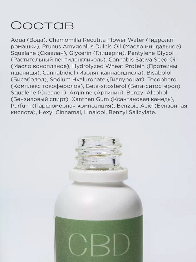 Aqua (Вода), Chamomilla Recutita Flower Water (Гидролат ромашки), Prunus Amygdalus Dulcis Oil (Масло миндальное), Squalane (Сквалан), Glycerin (Глицерин), Pentylene Glycol (Растительный пентиленгликоль), Cannabis Sativa Seed Oil (Масло конопляное), Hydrolyzed Wheat Protein (Протеины пшеницы), Cannabidiol (Изолят каннабидиола), Bisabolol (Бисаболол), Sodium Hyaluronate (Гиалуронат), Tocopherol (Комплекс токоферолов), Beta-sitosterol (Бета-ситостерол), Squalene (Сквален), Arginine (Аргинин), Benzyl Alcohol (Бензиловый спирт), Xanthan Gum (Ксантановая камедь), Parfum (Парфюмерная композиция), Benzoic Acid (Бензойная кислота), Hexyl Cinnamal, Linalool, Benzyl Salicylate.
