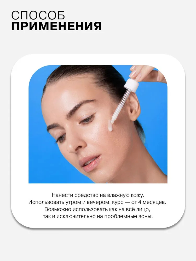 Нанести средство на влажную кожу. Использовать утром и вечером, курс — от 4 месяцев. Возможно использовать как на всё лицо, так и исключительно на проблемные зоны.