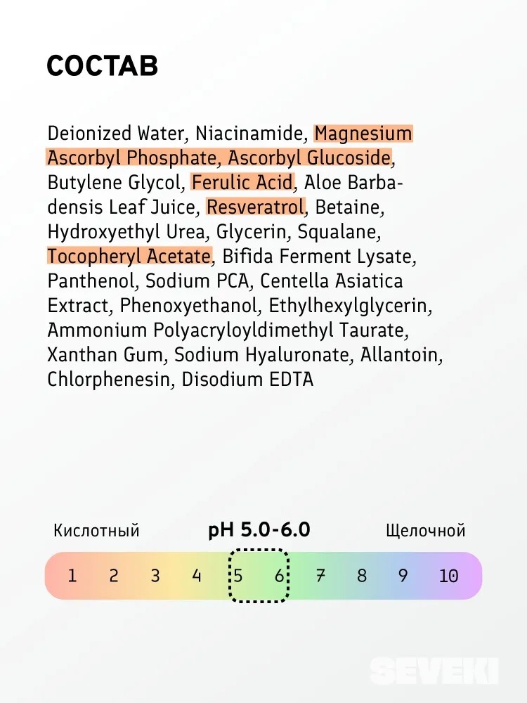 Deionized Water, Niacinamide, Magnesium Ascorbyl Phosphate, Ascorbyl Glucoside, Butylene Glycol, Ferulic Acid, Aloe Barbadensis Leaf Juice, Resveratrol, Betaine, Hydroxyethyl Urea, Glycerin, Squalane, Tocopheryl Acetate, Bifida Ferment Lysate, Panthenol, Sodium PCA, Centella Asiatica Extract, Phenoxyethanol, Ethylhexylglycerin, Ammonium Polyacryloyldimethyl Taurate, Xanthan Gum, Sodium Hyaluronate, Allantoin, Chlorphenesin, Disodium EDTA.