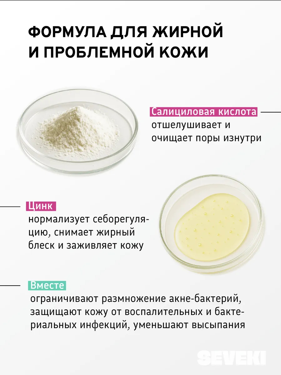 Цинк и Салициловая кислота ограничивают размножение акне-бактерий, защищают кожу от воспалительных, бактериальных и грибковых инфекций, уменьшает высыпания.