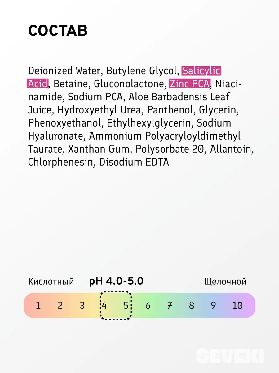 Содержит 1% Цинковой соли (Zinc PCA) – способствует нормализации выработки кожного сала, снимает жирный блеск, контролирует повышенное выделение себума, способствует заживлению кожи.