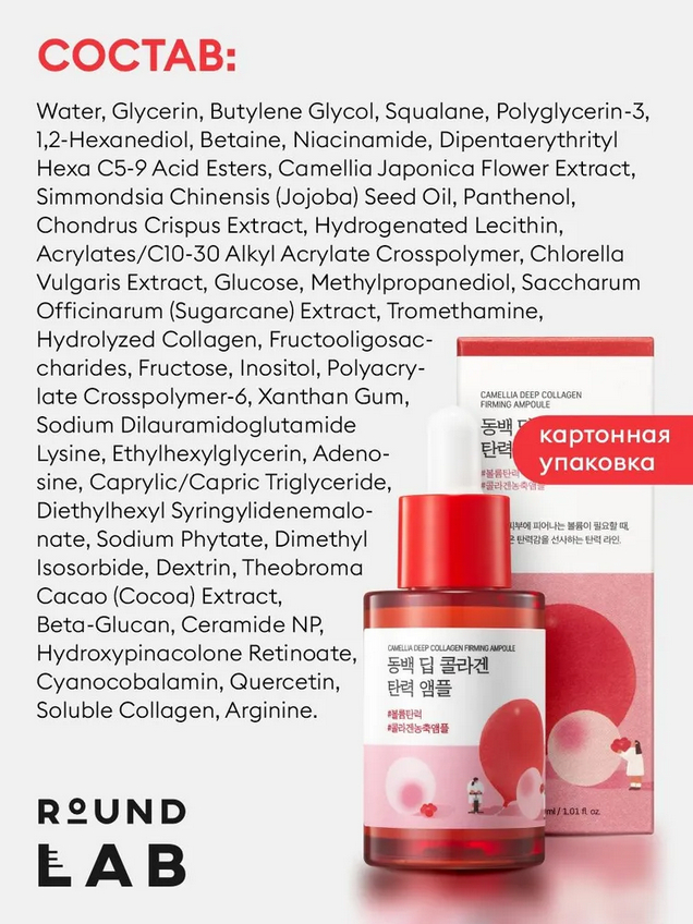 Укрепляющая коллагеновая ампула с камелией предназначена для борьбы с первыми признаками старения, уплотняет ткани и препятствует птозу. Стимулирует синтез коллагена и эластина, повышает тургор и поддерживает упругость кожи.