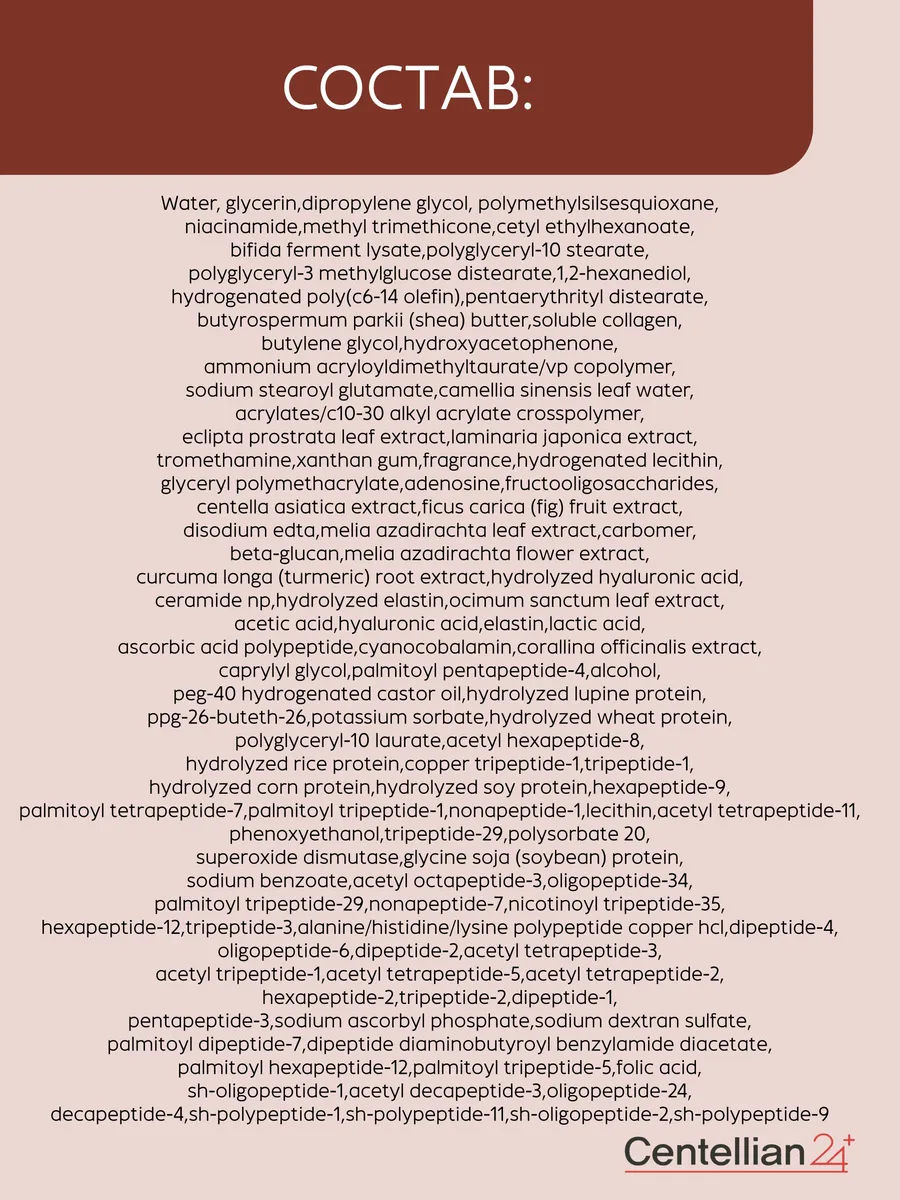 Water, Glycerin, Dipropylene Glycol, Polymethylsilsesquioxane, Niacinamide, Methyl Trimethicone, Cetyl Ethylhexanoate, Bifida Ferment Lysate, Polyglyceryl-10 Stearate, Polyglyceryl-3 Methylglucose Distearate, 1,2-hexanediol, Hydrogenated Poly (c6-14 Olefin), Pentaerythrityl Distearate, Butyrospermum Parkii (shea) Butter, Soluble Collagen, Butylene Glycol, Hydroxyacetophenone, Ammonium Acryloyldimethyltaurate/vp Copolymer, Sodium Stearoyl Glutamate, Camellia Sinensis Leaf Water, Acrylates/c10-30 Alkyl Acrylate Crosspolymer, Eclipta Prostrata Leaf Extract, Laminaria Japonica Extract, Tromethamine, Xanthan Gum, Fragrance, Hydrogenated Lecithin, Glyceryl Polymethacrylate, Adenosine, Fructooligosaccharides, Centella Asiatica Extract, Ficus Carica (fig) Fruit Extract, Disodium Edta, Melia Azadirachta Leaf Extract, Carbomer, Beta-glucan, Melia Azadirachta Flower Extract, Curcuma Longa (turmeric) Root Extract, Hydrolyzed Hyaluronic Acid, Ceramide NP, Hydrolyzed Elastin, Ocimum Sanctum Leaf Extract, Acetic Acid, Hyaluronic Acid, Elastin, Lactic Acid, Ascorbic Acid Polypeptide, Cyanocobalamin, Corallina Officinalis Extract, Caprylyl Glycol, Palmitoyl Pentapeptide-4, Alcohol, Peg-40 Hydrogenated Castor Oil, Hydrolyzed Lupine Protein, Ppg-26-buteth-26, Potassium Sorbate, Hydrolyzed Wheat Protein, Polyglyceryl-10 Laurate, Acetyl Hexapeptide-8, Hydrolyzed Rice Protein, Copper Tripeptide-1, Tripeptide-1, Hydrolyzed Corn Protein, Hydrolyzed Soy Protein, Hexapeptide-9, Palmitoyl Tetrapeptide-7, Palmitoyl Tripeptide-1, Nonapeptide-1, Lecithin, Acetyl Tetrapeptide-11, Phenoxyethanol, Tripeptide-29, Polysorbate 20, Superoxide Dismutase, Glycine Soja (soybean) Protein, Sodium Benzoate, Acetyl Octapeptide-3, Oligopeptide-34, Palmitoyl Tripeptide-29, Nonapeptide-7, Nicotinoyl Tripeptide-35, Hexapeptide-12, Tripeptide-3, Alanine/histidine/lysine Polypeptide Copper Hcl, Dipeptide-4, Oligopeptide-6, Dipeptide-2, Acetyl Tetrapeptide-3 ,acetyl Tripeptide-1, Acetyl Tetrapeptide-5, Acetyl Tetrapeptide-2, Hexapeptide-2, Tripeptide-2, Dipeptide-1, Pentapeptide-3, Sodium Ascorbyl Phosphate, Sodium Dextran Sulfate, Palmitoyl Dipeptide-7, Dipeptide Diaminobutyroyl Benzylamide Diacetate, Palmitoyl Hexapeptide-12, Palmitoyl Tripeptide-5, Folic Acid, Sh-oligopeptide-1, Acetyl Decapeptide-3, Oligopeptide-24, Decapeptide-4, Sh-polypeptide-1, Sh-polypeptide-11, Sh-oligopeptide-2, Sh-polypeptide-9