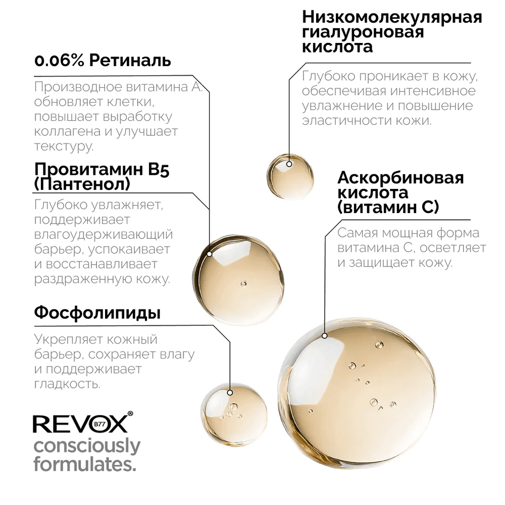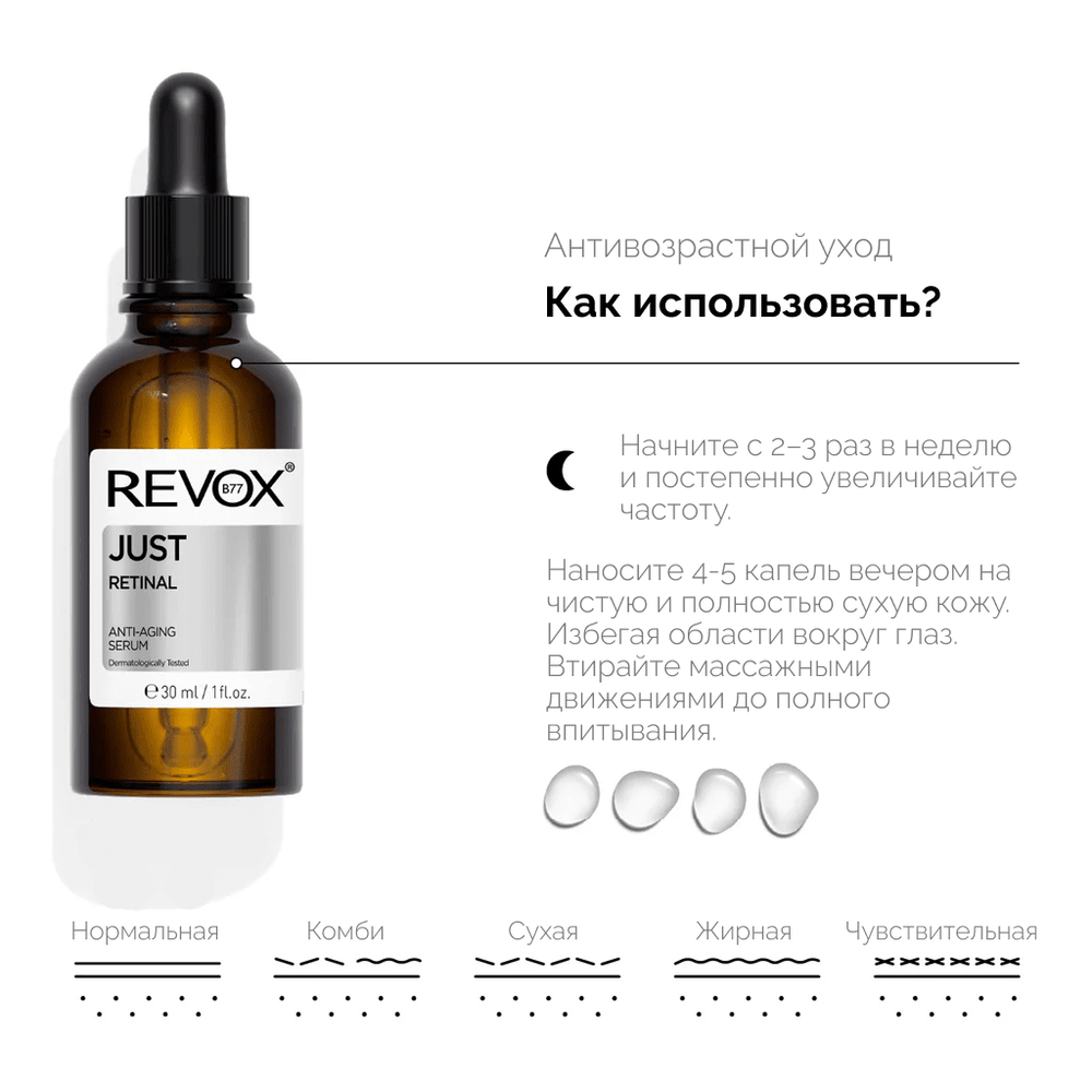 Этот мощный ингредиент влияет на процессы обновления клеток и способствует выработке коллагена, что приводит к улучшению текстуры и тона кожи. Эта нежная формула разглаживает и осветляет кожу, помогает сохранить ее здоровый вид и даже обладает свойствами, полезными для кожи, склонной к акне. Благодаря обновляющему действию ретинола сыворотка помогает удалить омертвевшие клетки кожи и очистить поры, предотвращая появление несовершенств. Не сочетать с: Не сочетать с отшелушивающими средствами и другими продуктами с ретинолом. НУЖНО ЛИ ИСПОЛЬЗОВАТЬ УВЛАЖНЯЮЩИЙ КРЕМ ПОСЛЕ ЭТОГО? Поскольку ретиналь может немного подсушивать кожу, необходимо использовать хороший увлажняющий крем. Мы рекомендуем REVOX B77 JUST с аминокислотами коллагена и гиалуроновой кислотой.