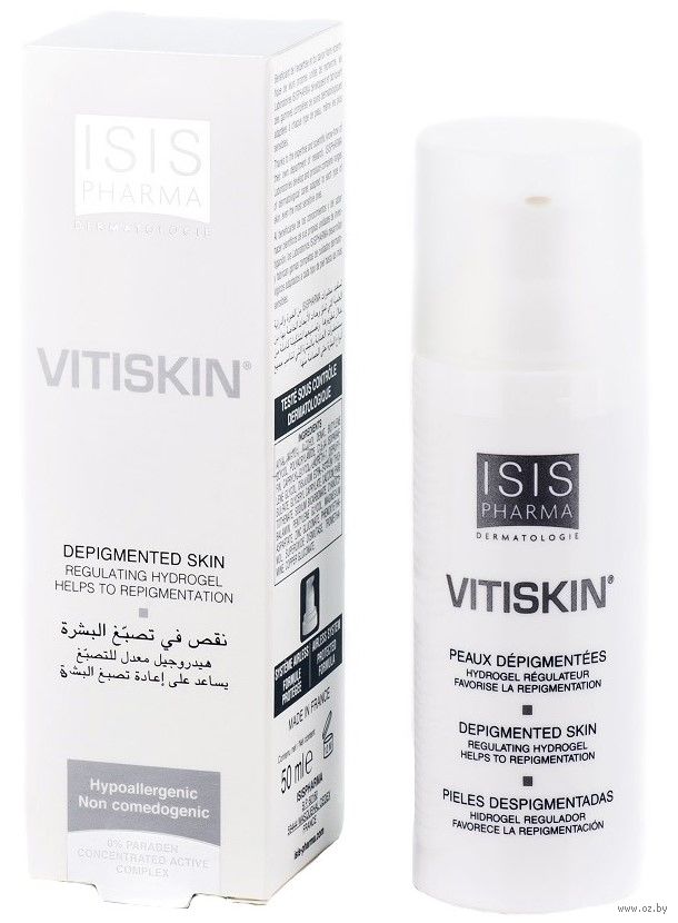 "Vitiskin" разработан специально для кожи с дефицитом пигментации. Формула с комбинацией активных ингредиентов способствует репигментации кожи. Текстура геля легко проникает и оптимизирует поглощение активных ингредиентов.