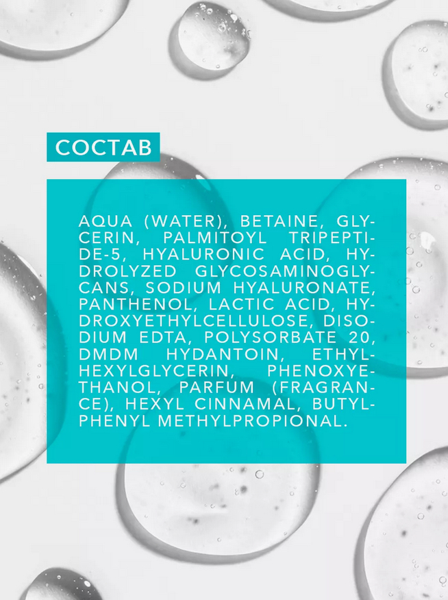 Aqua (Water), Betaine, Glycerin, Palmitoyl Tripeptide-5, Hyaluronic Acid, Hydrolyzed Glycosaminoglycans, Sodium Hyaluronate, Panthenol, Lactic Acid, Hydroxyethylcellulose, Disodium EDTA, Polysorbate 20, DMDM Hydantoin, Ethylhexylglycerin, Phenoxyethanol, Parfum (Fragrance), Hexyl Cinnamal, Butylphenyl Methylpropional.
