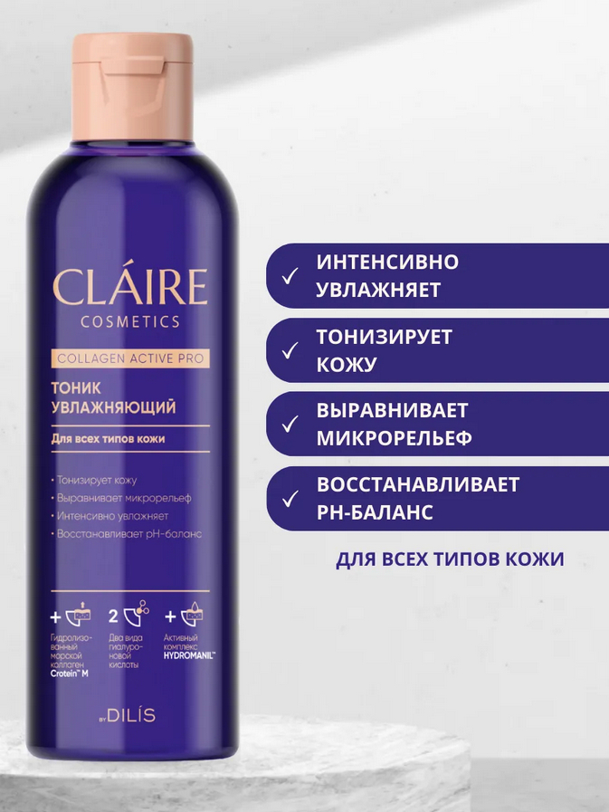 Увлажняющий тоник с коллагеном отлично подготавливает кожу к дальнейшему уходу. Тонизирующее средство на основе морского коллагена и активного увлажняющего комплекса HYDROMANIL™ с первых секунд освежает кожу лица, придает ей здоровый вид. Активные компоненты с гиалуроновой кислотой двух видов увлажняют кожу на разных уровнях, улучшают ее микрорельеф и устраняют чувство стянутости.