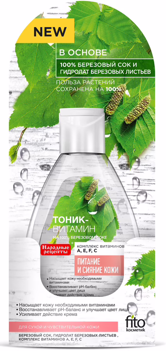 Тоник-витамин на 100% березовом соке и гидролате березовых листьев активно питает и увлажняет кожу, насыщает ее необходимыми витаминами А, Е, F, C. Тоник восстанавливает и смягчает кожу после умывания, подготавливает кожу к дальнейшему уходу и усиливает проникающую способность крема.