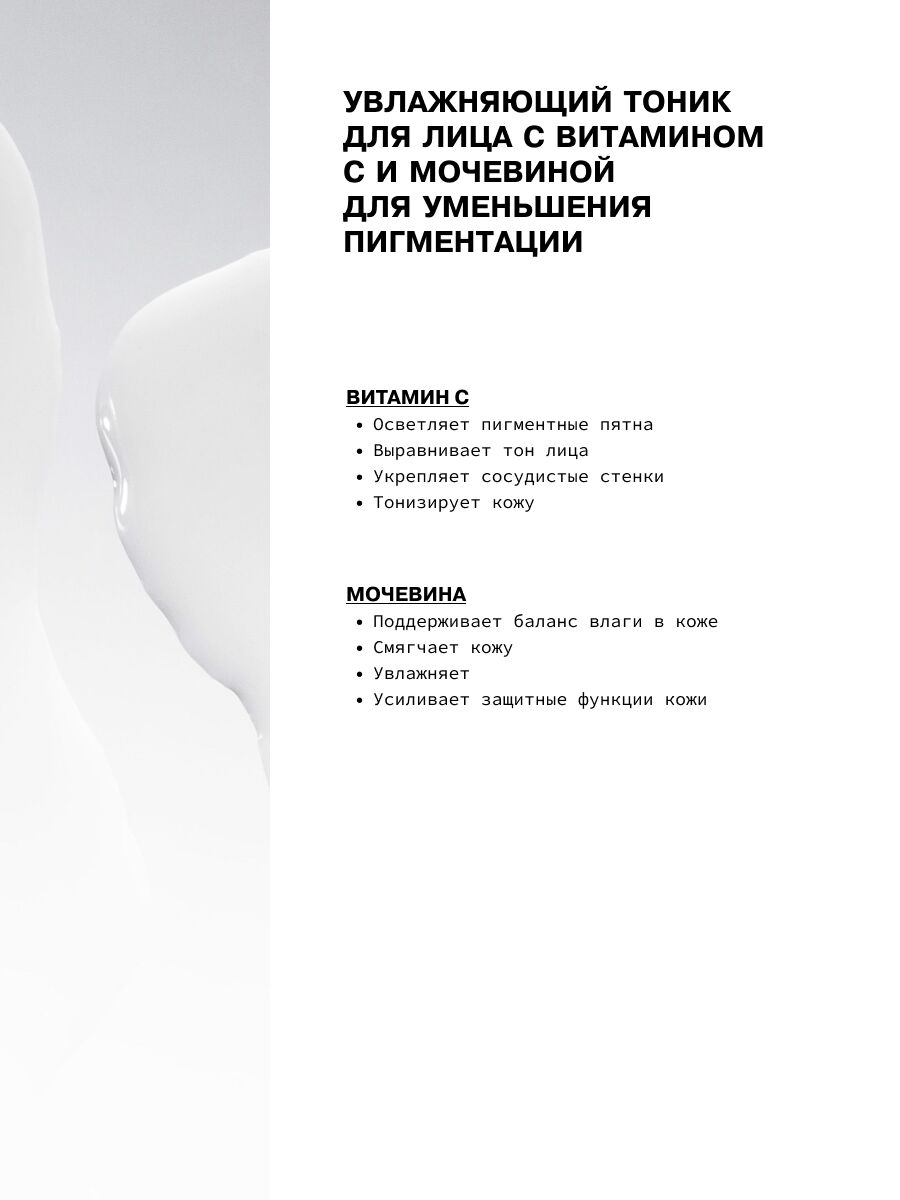 Мочевина обеспечивает глубокое увлажняющее действие тоника. Витамин С укрепляет сосуды, выравнивает тон кожи и осветляет пигментацию.
