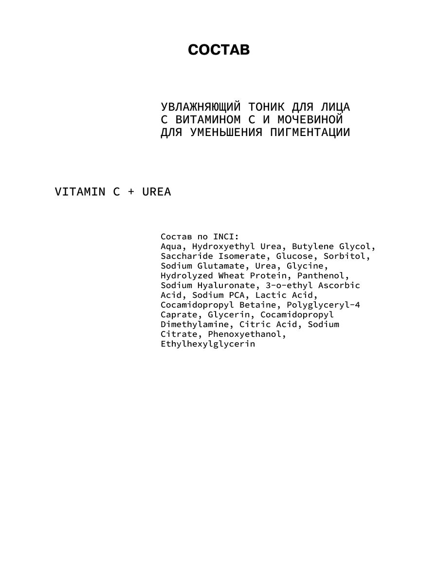 Aqua, Hydroxyethyl Urea, Butylene Glycol, Saccharide Isomerate, Glucose, Sorbitol, Sodium Glutamate, Urea, Glycine, Hydrolyzed Wheat Protein, Panthenol, Sodium Hyaluronate, 3-o-ethyl Ascorbic Acid, Sodium PCA, Lactic Acid, Cocamidopropyl Betaine, Polyglyceryl-4 Caprate, Glycerin, Cocamidopropyl Dimethylamine, Citric Acid, Sodium Citrate, Phenoxyethanol, Ethylhexylglycerin.Мы используем файлы cookie для обеспечения удобства работы с сайтом и его контакта с пользователем.