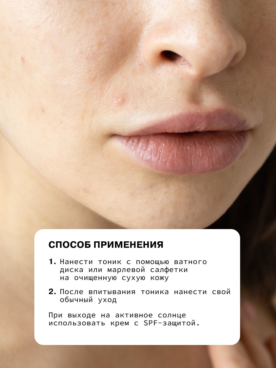Нанести тоник с помощью ватного диска или марлевой салфетки на очищенную сухую кожу. После впитывания тоника нанести свой обычный уход. При выходе на активное солнце использовать крем с SPF-защитой.Состав
