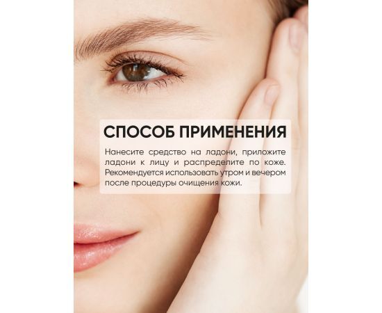 Нанесите средство на ладони, приложите ладони к лицу и распределите по коже. Рекомендуется использовать утром и вечером после процедуры очищения кожи.Состав