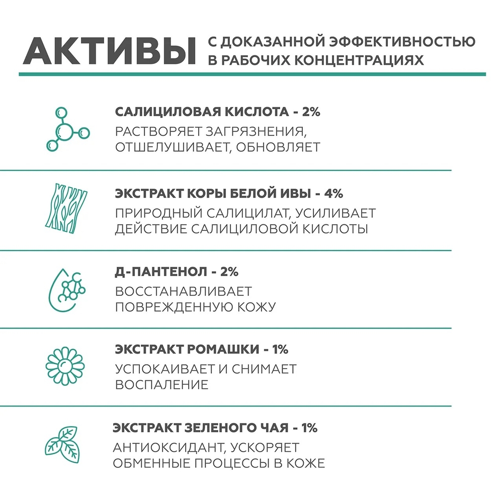 | Активные ингредиенты | Салициловая кислота, экстракт зеленого чая, экстракт ромашки |
