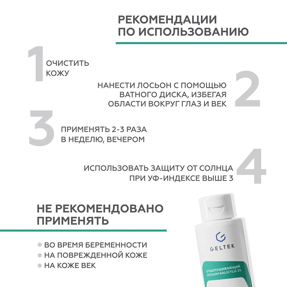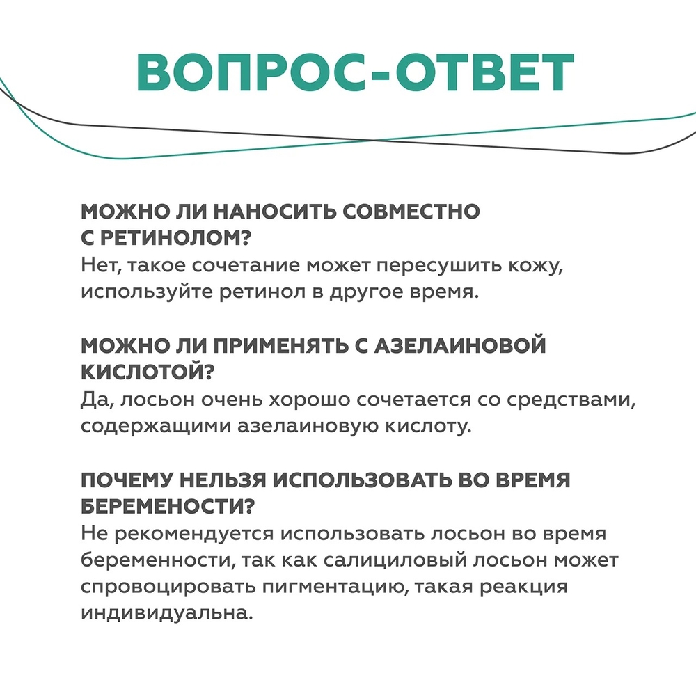Отшелушивающий лосьон – отшелушивающий лосьон с салициловой кислотой, мягкий, бесспиртовой эксфолиант, не требующий смывания водой, который деликатно отшелушивает ороговевшие клетки эпидермиса, способствует очищению и сужению пор, уменьшению жирного блеска, минимизирует воспалительные процессы и предотвращает образование комедонов, закупоренных пор (черных точек), выравнивает тон, придает коже гладкость и сияние. Также, подходит для себорейных зон тела (спины, груди, плечей). Средство не нужно смывать, при этом оно очень комфортно ощущается на лице. В составе нет спирта, поэтому лосьон не сушит и не стягивает кожу.