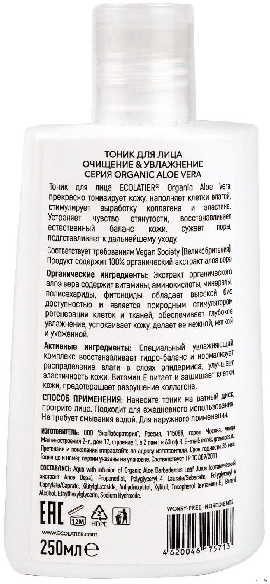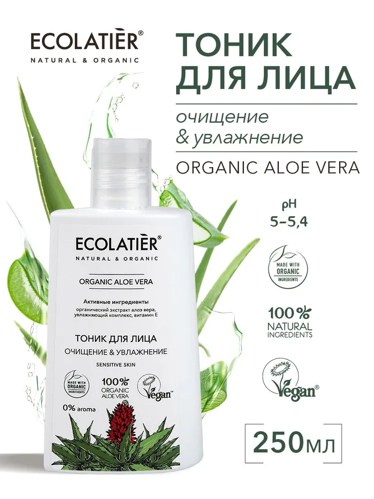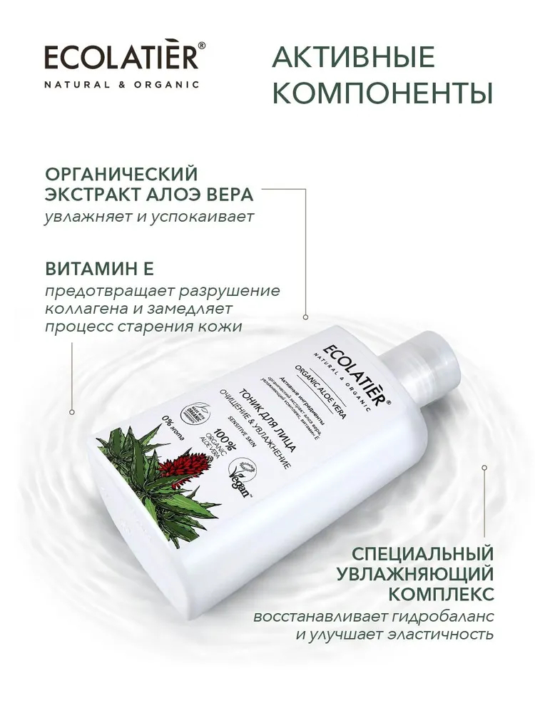 Органические ингредиенты: экстракт органического алоэ вера содержит витамины, аминокислоты, минералы, полисахариды, фитонциды, обладает высокой био доступностью и является природным стимулятором регенерации клеток и тканей, обеспечивает глубокое увлажнение, успокаивает кожу, делает ее нежной, мягкой и ухоженной.