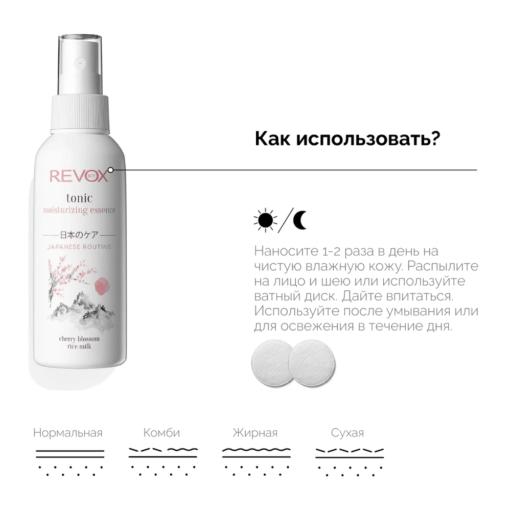 Нежный спрей увлажняет сухую и уставшую кожу, восстанавливая её естественный баланс и придавая ей сияние. Быстро впитывается и не оставляет ощущения липкости. Формула богата успокаивающим экстрактом цветков японской вишни, который японские женщины считают источником молодости и свежести. Экстракт граната регулирует выработку кожного сала. Гиалуроновая кислота защищает от потери влаги, а рисовое молоко повышает эластичность кожи.