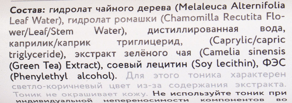 Гидролат чайного дерева (Melaleuca Alternifolia Leaf Water), гидролат ромашки (Chamomilla Recutita Flower/Leaf/Stem Water), дистиллированная вода, экстракт зелёного чая (Camelia sinensis (Green Tea) Extract), сорбат калия (Potassium Sorbate), бензоат натрия (Sodium Benzoate).Мы используем файлы cookie для обеспечения удобства работы с сайтом и его контакта с пользователем.