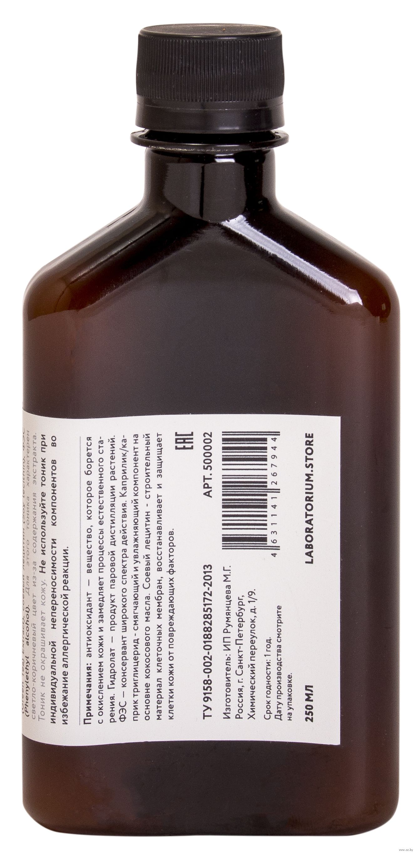 Нанесите тоник на ватный диск и протрите лицо. Смывать тоник водой не нужно. Используйте утром и вечером после умывания. Вы также можете разбавить тоником сухие маски для лица и убтан "Laboratorium".Состав