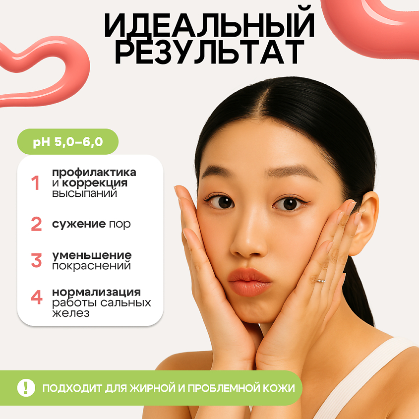 Ниацинамид и сбалансированный комплекс из хелата цинка, органического кремния, салициловой кислоты и серы мягко снижают чрезмерную жирность кожи, снижают раздражение и выравнивают тон кожи в областях пятен постакне.