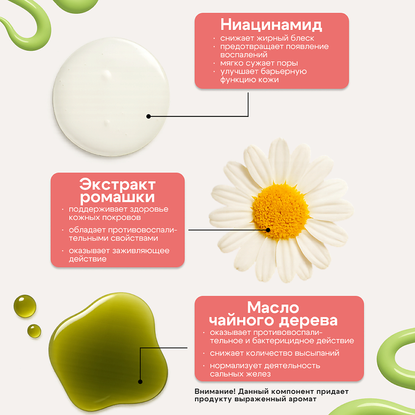 | Активные ингредиенты | Ниацинамид (витамин в3), пантенол (витамин в5), салициловая кислота, цинк, экстракт алоэ |