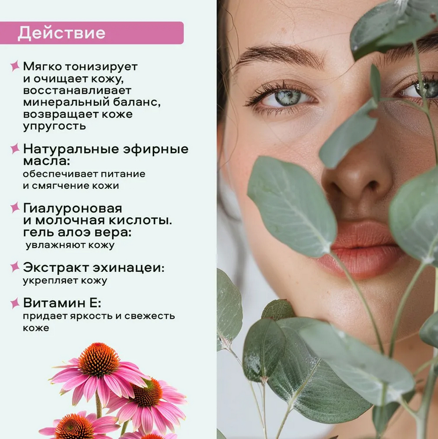 Насыщенность тоника натуральными эфирными маслами обеспечивает питание, смягчение. Гиалуроновая и молочная кислоты, гель алоэ-вера увлажняют. Экстракт эхинацеи укрепляет кожу, витамин E придает ей яркость и свежесть.