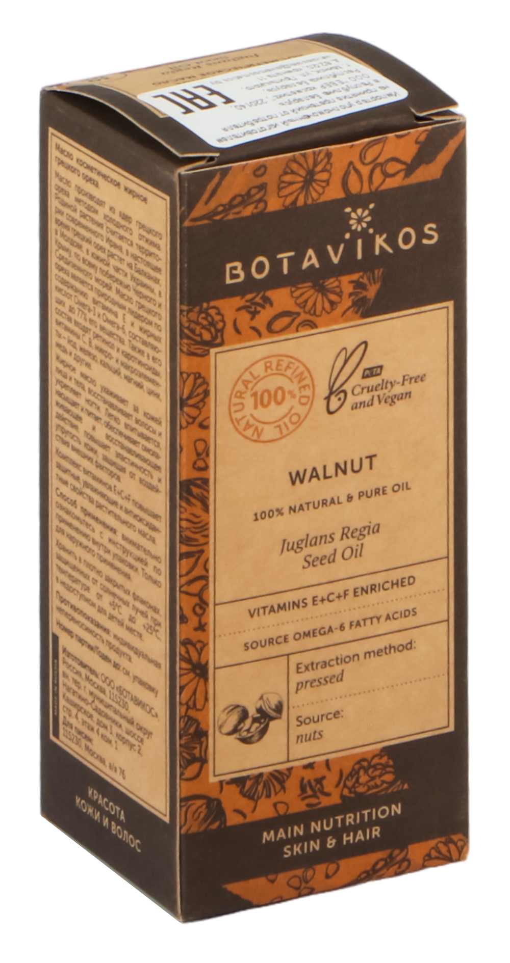 Натуральное жирное масло Грецкий орех 100% Juglans Regia L. Oil от Botavikos содержит 100% рафинированное жирное масло Juglans regia oil, полученное методом прессования.
