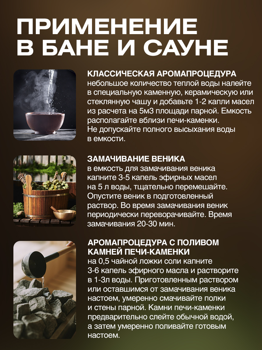 Классическая аромапроцедура: небольшое количество теплой воды налейте в специальную каменную, керамическую или стеклянную чашу и добавьте 1-2 капли масел из расчета на 5 метров кубических площади парной. Емкость располагайте вблизи печи-каменки, что обеспечит равномерное испарение смеси. Не допускайте полного высыхания воды в емкости.Состав