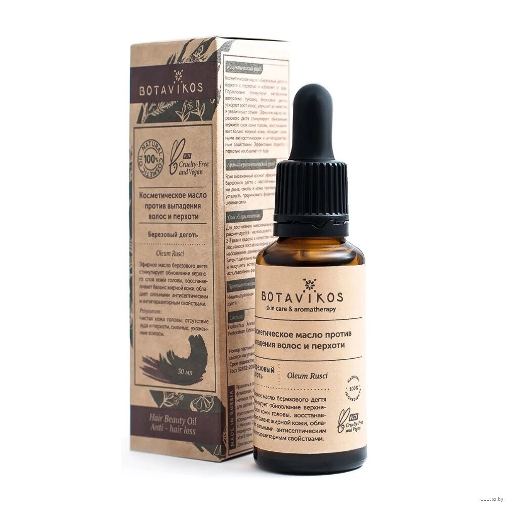 Эфирное масло берёзового дёгтя стимулирует обновление верхнего слоя кожи головы, восстанавливает баланс жирной кожи, обладает сильными антисептическими и антипаразитарными свойствами. Эффективно борется с перхотью и избавляет от зуда.