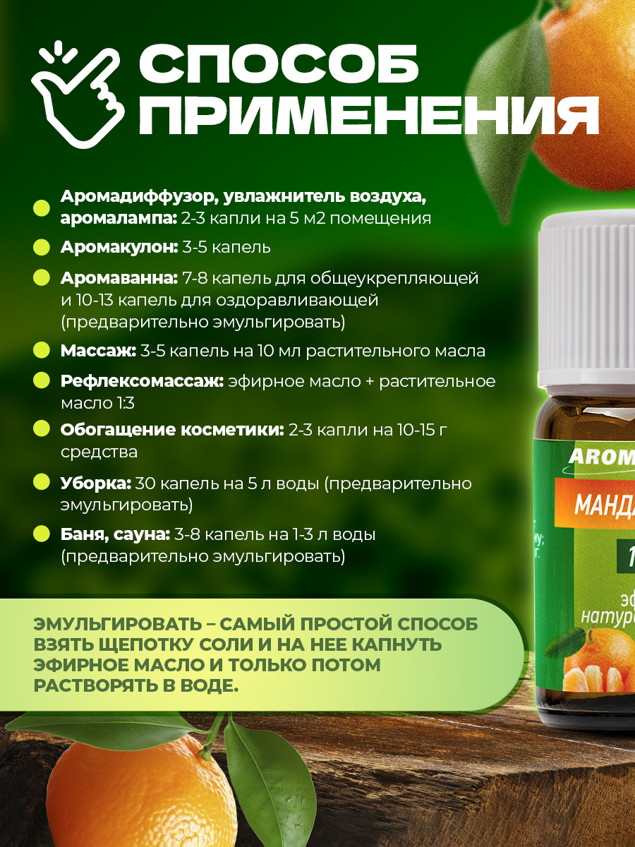 Массаж и растирания. В растительном косметическом масле, креме размешать эфирное масло (на 10 мл 3-5 капель), нанести на кожу, после чего проводить массаж в соответствие с состоянием организма.